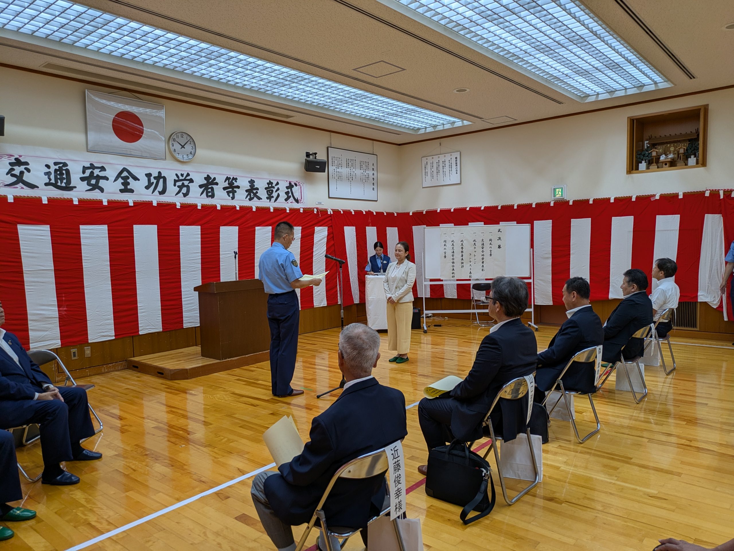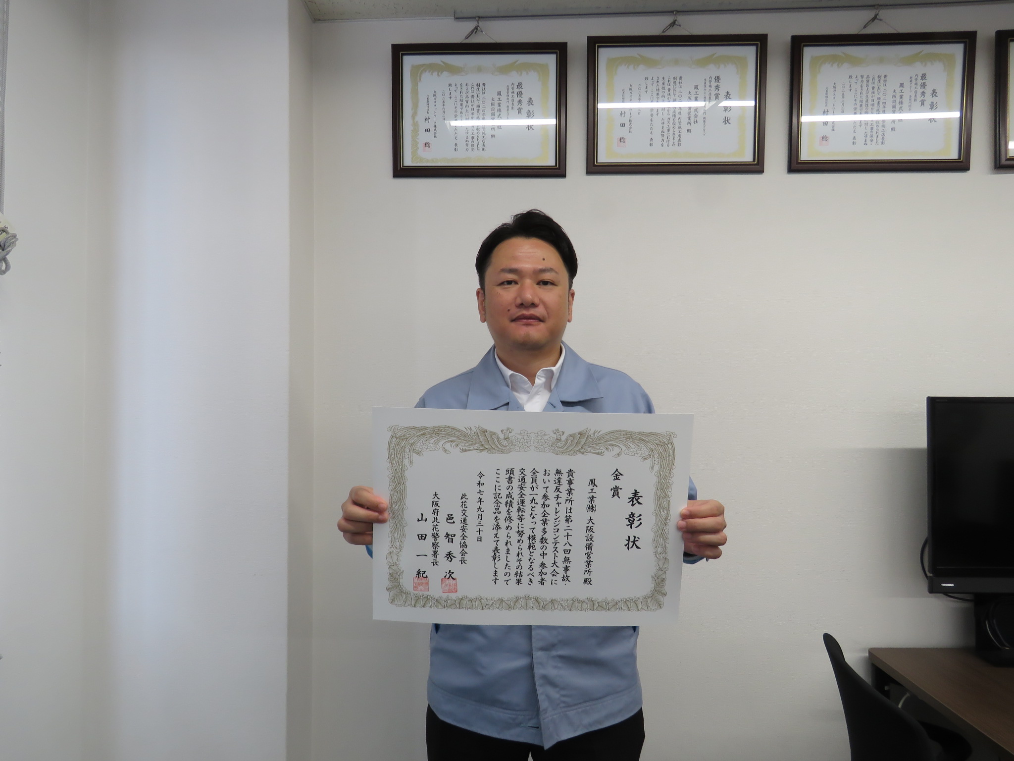 「令和7年度 交通安全功労者等及び第28回此花地区無事故・無違反チャレンジコンテスト表彰式」が2025年9月30日に此花警察署別館講堂にて執り行われました。交通安全功労者表彰では、当社から参加した山口室長が、交通安全協会等役員の部において表彰されました。