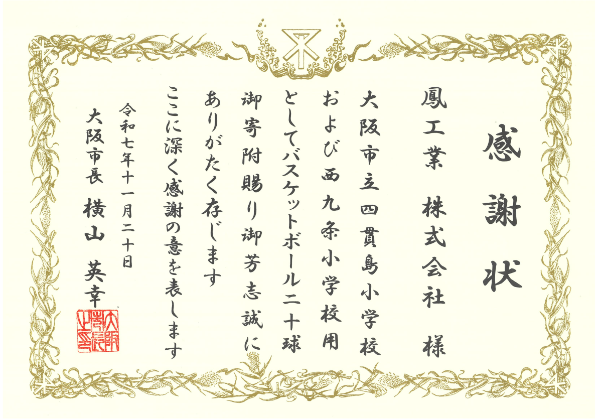 2026.03.16 サステナビリティ 横山大阪市長より感謝状をいただきました このたび、大阪市立四貫島小学校および西九条小学校へのバスケットボール寄附につき、横山大阪市長より感謝状を賜りました。 今後も社会貢献活動を通じて地域の活性化に努めてまいります。 前の記事 一覧へ お知らせ NEWS カテゴリ お知らせその他イベント採用情報社内行事サステナビリティ 年度別 2026 2025 2024 2023 2022